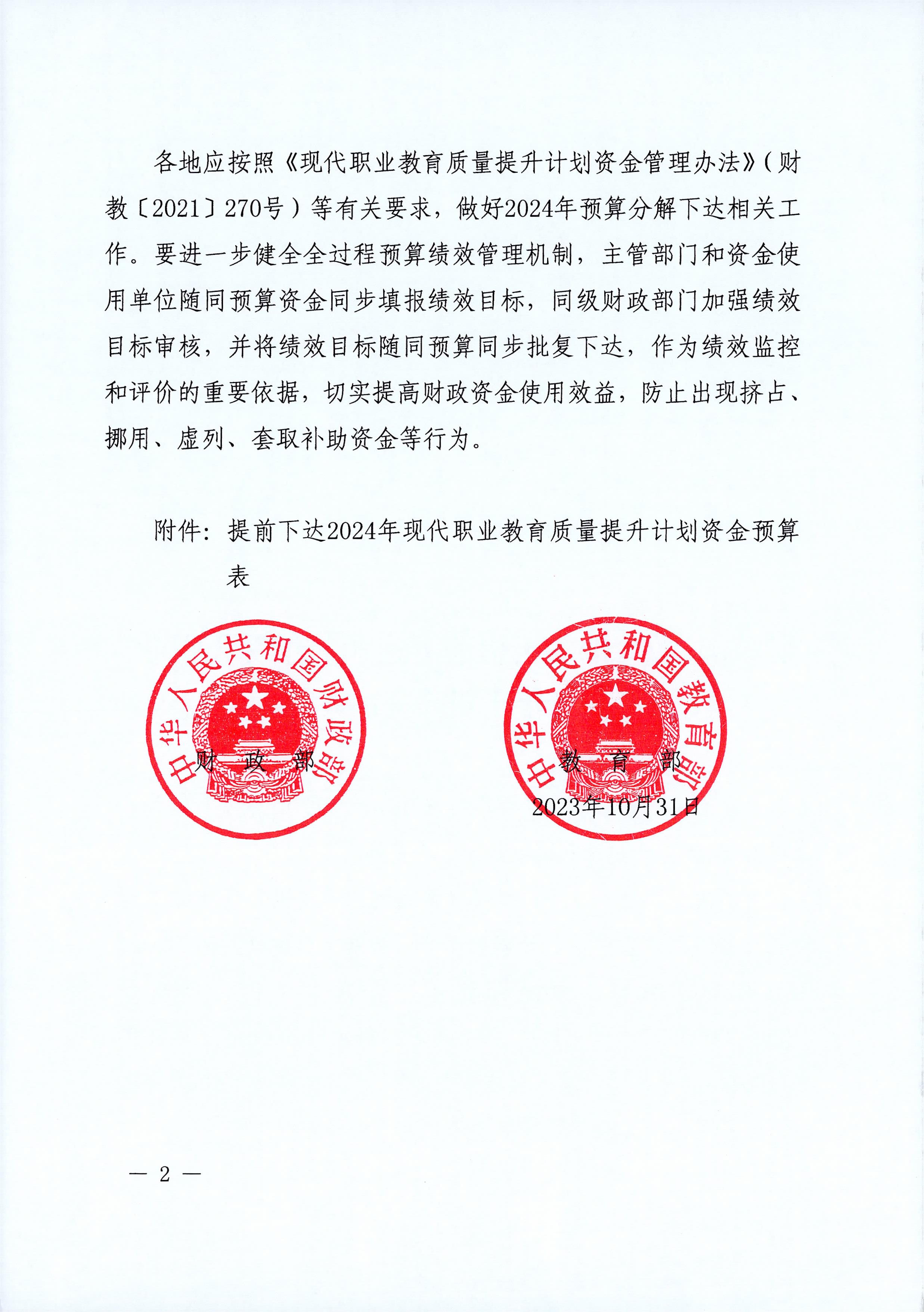 近日,財政部、教育部發(fā)布《提前下達(dá)2024年現(xiàn)代職業(yè)教育質(zhì)量提升計劃資金預(yù)算的通知》