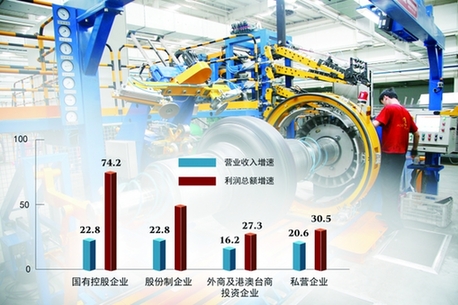 數(shù)據(jù)顯示,10月份私營企業(yè)利潤(rùn)同比增長(zhǎng)28.8%,增速較上月加快21個(gè)百分點(diǎn),連續(xù)兩個(gè)月回升。其中,有14個(gè)行業(yè)利潤(rùn)增速在20%以上,呈現(xiàn)良好發(fā)展勢(shì)頭。私營企業(yè)對(duì)規(guī)模以上工業(yè)企業(yè)利潤(rùn)增長(zhǎng)的貢獻(xiàn)率為42.7%,較上月提高27.6個(gè)百分點(diǎn)。