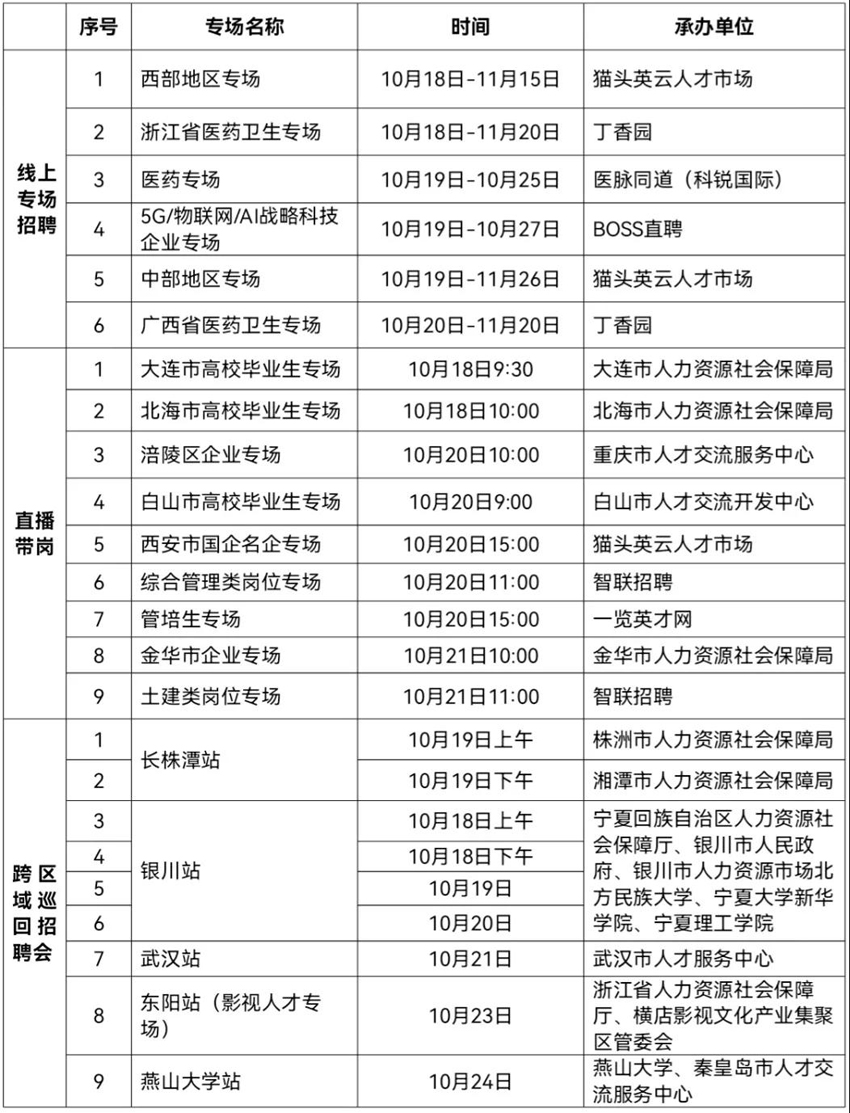 線下活動9場:舉辦長株潭站(2場)、銀川站(4場)、武漢站、東陽站、燕山大學(xué)站等9場跨區(qū)域巡回招聘會,除本地用人單位外,將邀請外省市人社部門組織用人單位組團(tuán)參加。